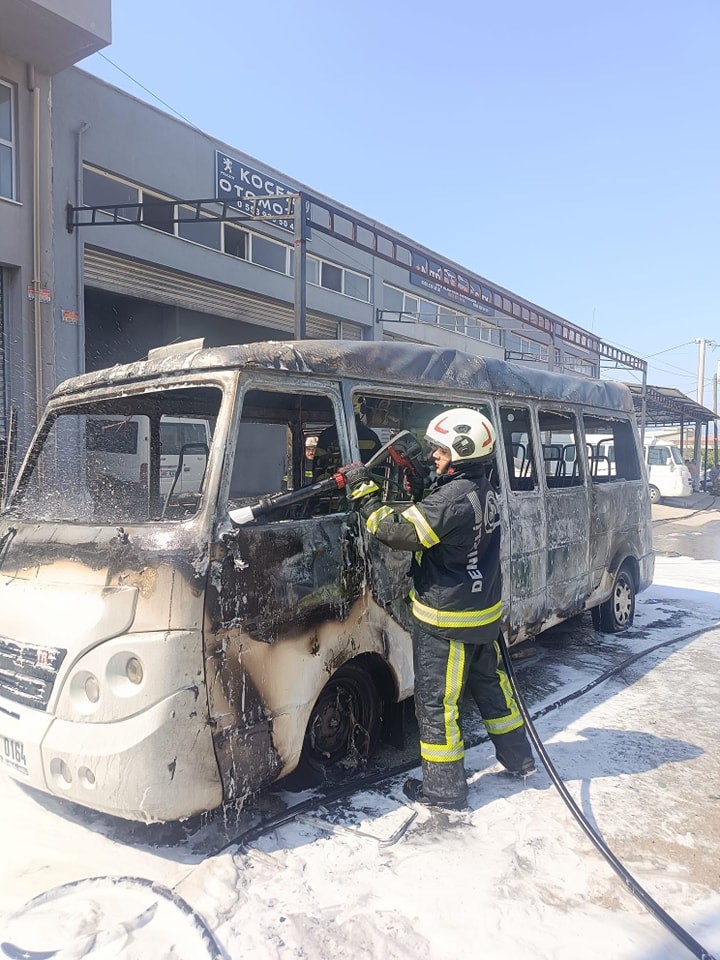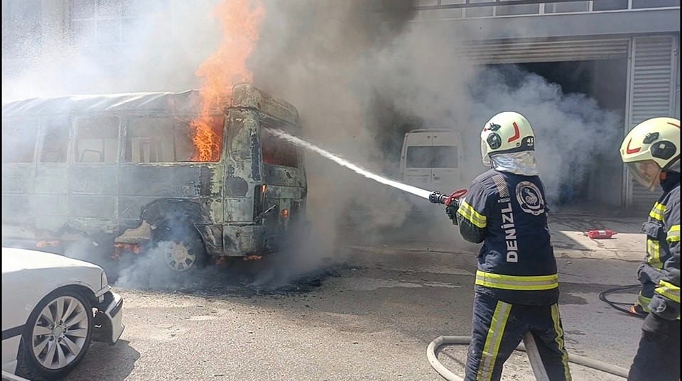 Denizli’nin Merkezefendi ilçesinde seyir halindeki minibüs alev alev yandı. İtfaiye ekiplerinin müdahaleleri tarafından alevler kontrol altına alınırken minibüs kullanılamaz hale geldi.